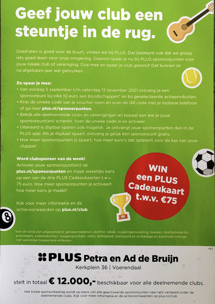 In deze tijden kunnen we elke steun gebruiken, schenk ons dus je sponsorpunt(en) en draag je steentje bij aan een financieel gezonde vereniging waar wij en jullie de komende jaren nog van mogen blijven genieten.